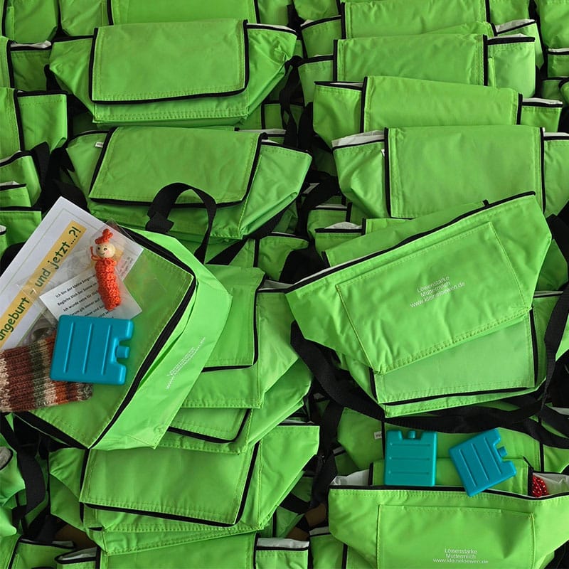 Um nach der Frühgeburt abgepumpte Muttermilch gut gekühlt von der Wochenstation, bzw. nach der Entlassung der Frühchenmama von zu Hause/aus dem Elternhaus zu ihrem Frühchen in der UMG transportiert zu bekommen, stellen wir jeder Frühchenfamilie eine Kühltasche mit einem passenden Kühlakku zur Verfügung. Seit dem Jahr 2022 haben wir bereits knapp 700 derartiger Taschen überreichen können.